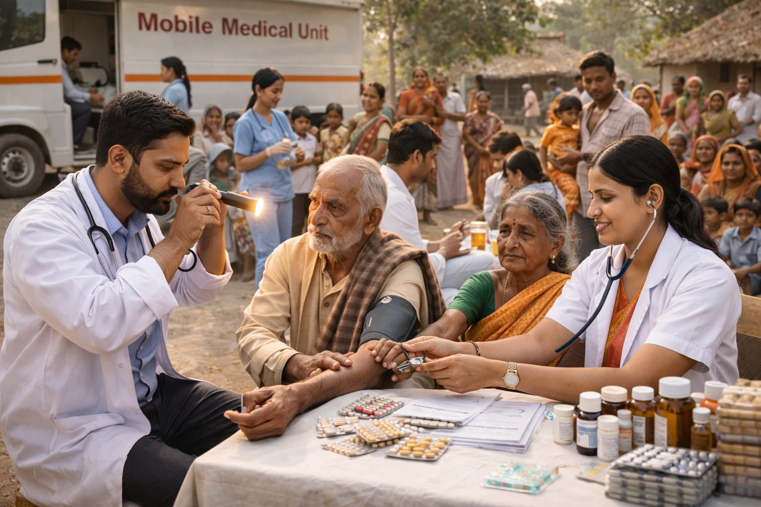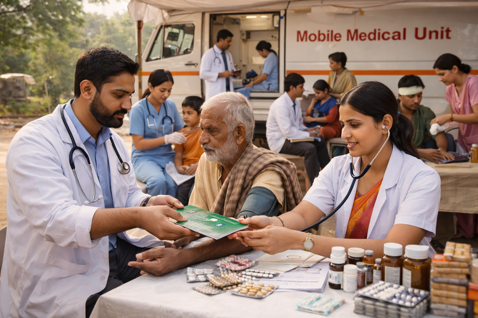 Health camps are organized in remote and underserved areas to provide free medical checkups, basic treatment, health awareness, and guidance, ensuring better healthcare access for vulnerable communities.