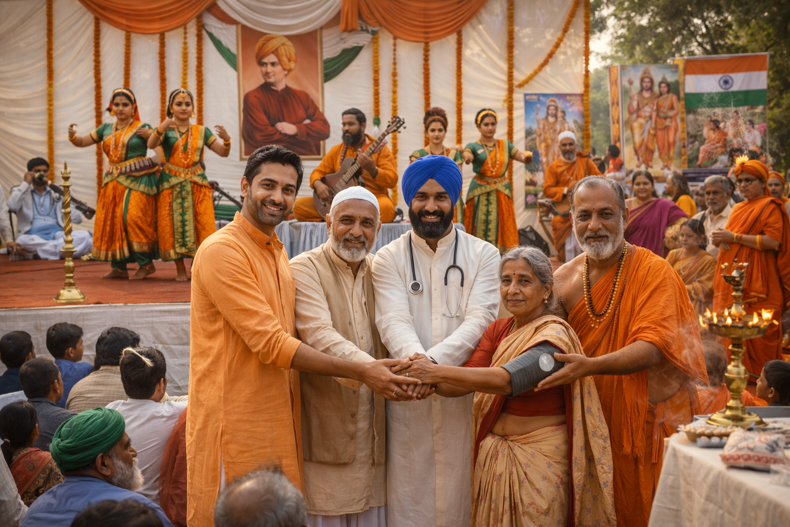 Organizing awareness programs and cultural activities, as well as inculcating essential values of ancient Indian culture and promoting communal harmony and religious tolerance.